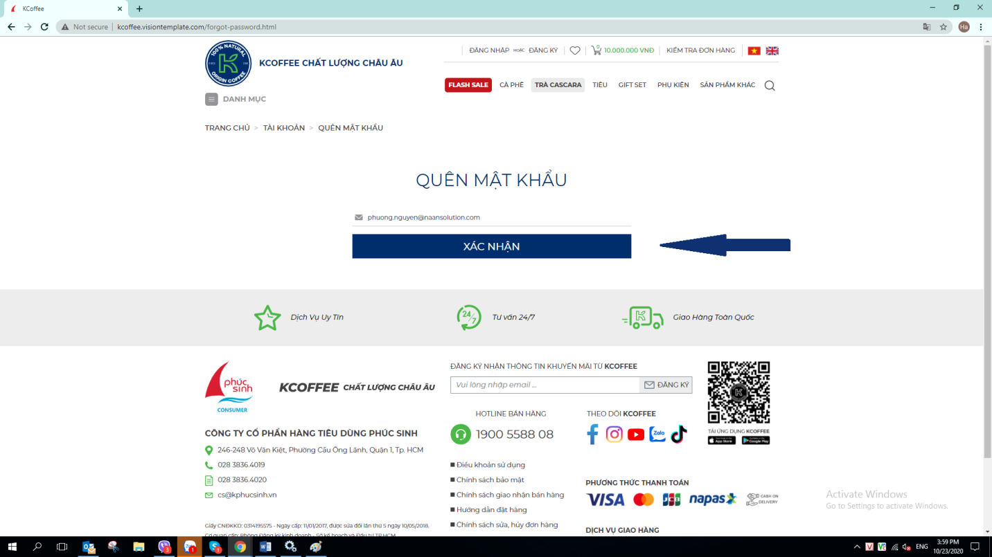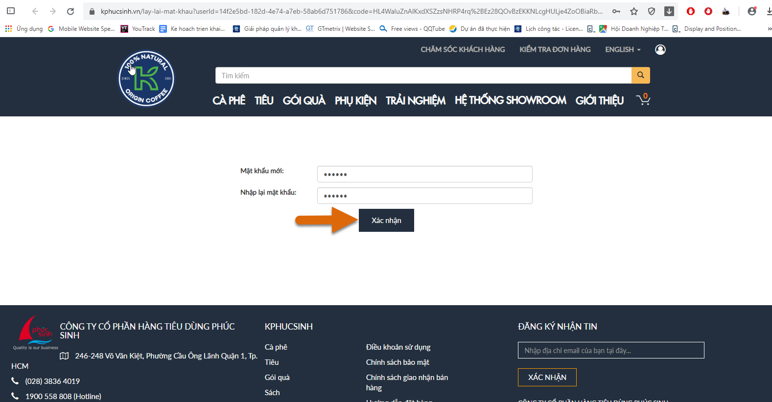 Quý khách tiến hành đổi mật khẩu trên giao diện lấy lại mật khẩu mà đường link xác nhận dẫn tới: nhập mật khẩu mới, nhập lại mật khẩu → bấm Xác nhận