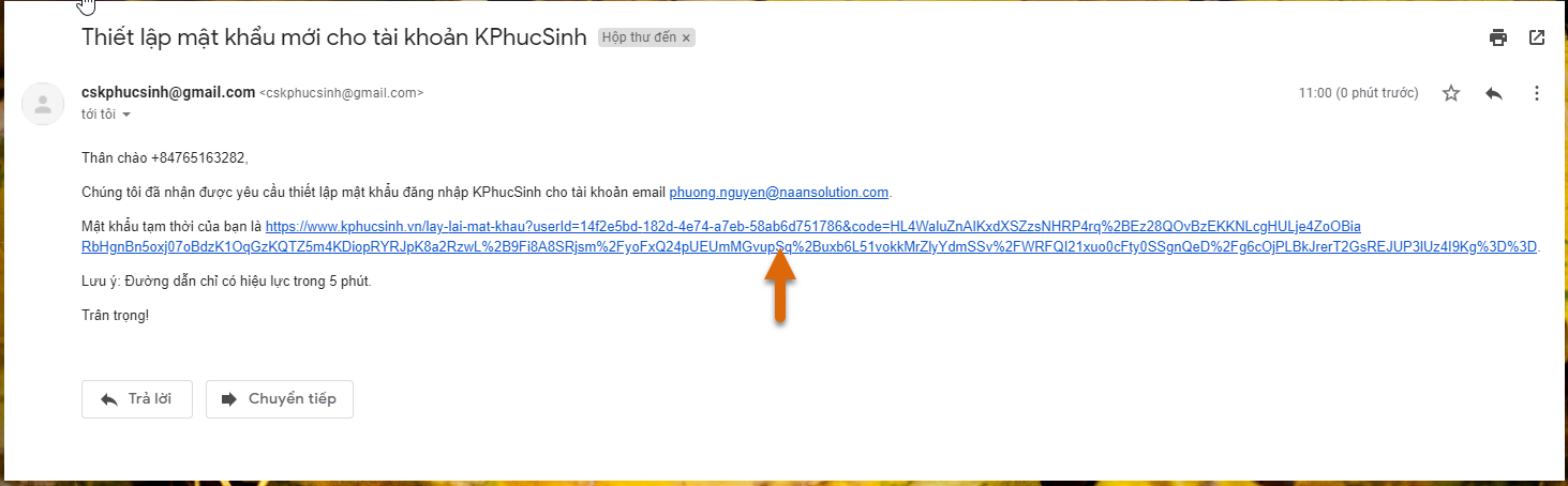 Bước 4: Hệ thống sẽ gửi thông báo kèm đường link xác nhận lấy lại mật khẩu vào địa chỉ mail Quý khách.