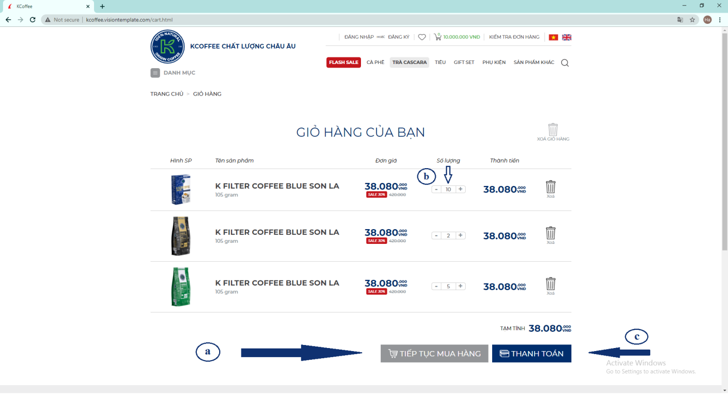 b. Điều chỉnh số lượng và cập nhật giỏ hàng