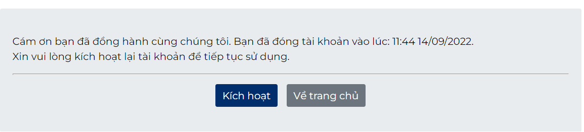 Bước 4: Nếu trong vòng 30 ngày người sử dụng đăng nhập lại thì hệ thống thể hiện dialogue. “Cám ơn bạn đã đồng hành cùng chúng tôi. Bạn đã đóng tài khoản vào lúc: DD/MM/YYYY HH:MM. Xin vui lòng kích hoạt lại tài khoản để tiếp tục sử dụng.” [Kích hoạt] [Thoát]
