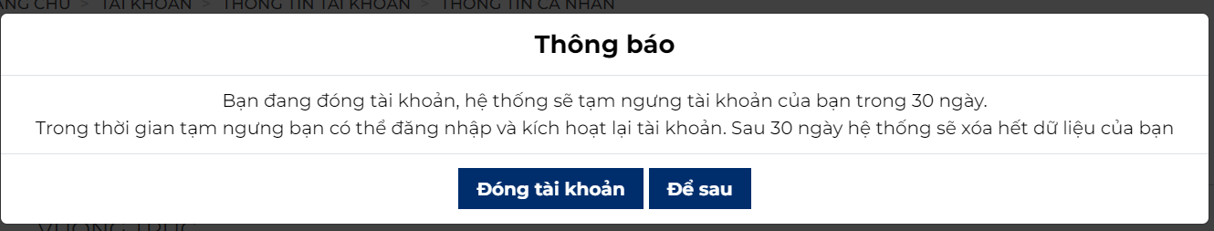 Bước 4: Sau khi bấm vào nút đóng tài khoản sẽ hiện ra thông báo